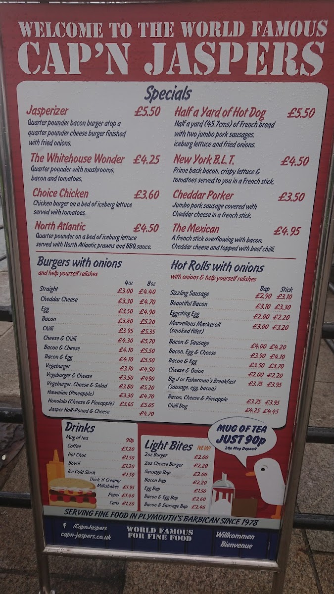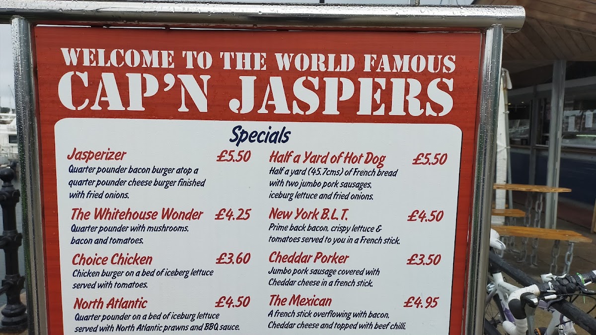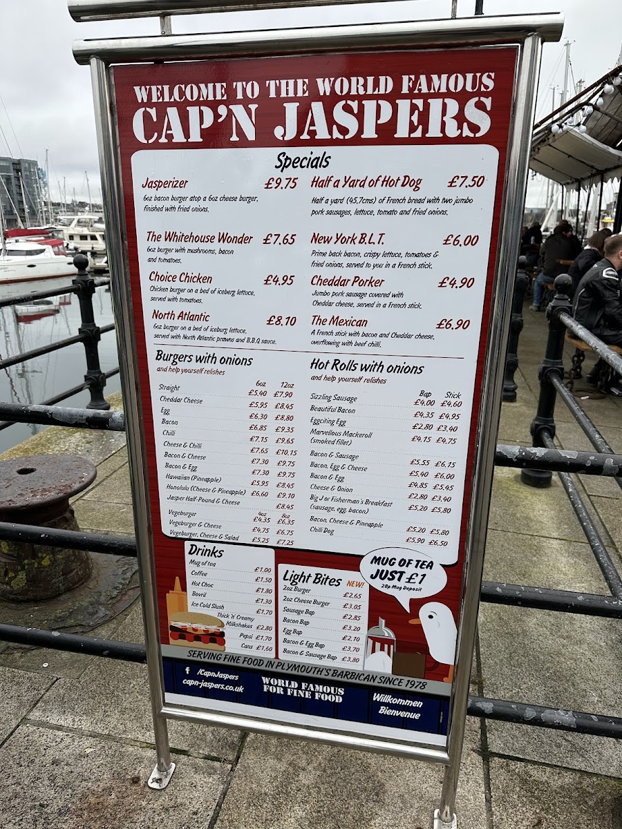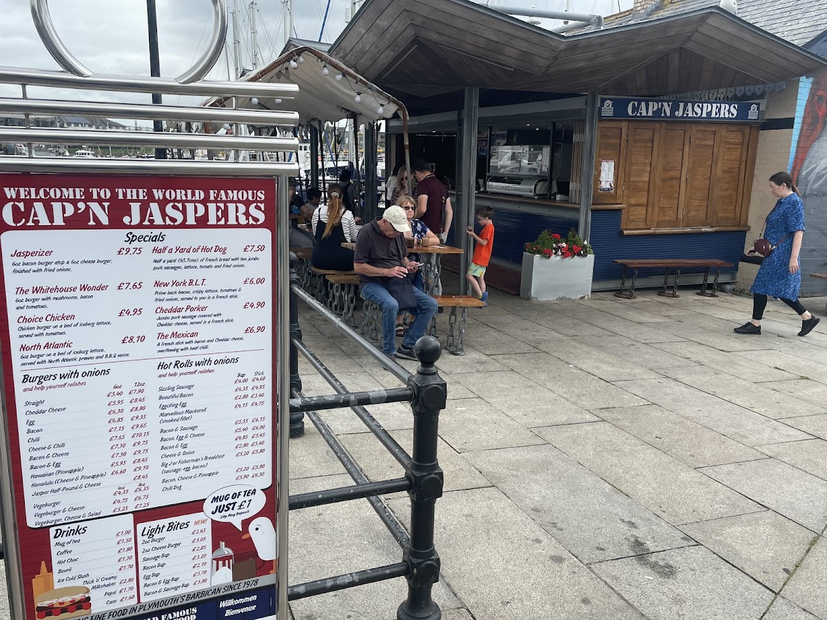 Welcome to Cap'n Jaspers, Plymouth's cherished dining spot, nestled at 18 The Barbican. Known for its vibrant atmosphere and friendly service, this establishment is loved by locals and visitors alike. The menu showcases a variety of mouthwatering burgers, from classic options like the Cheddar Cheese Burger (£5.95) to hearty choices like the Cheese & Chilli Burger (£7.65). Each burger is customizable with a selection of help-yourself relishes, making sure each bite is just as you prefer.